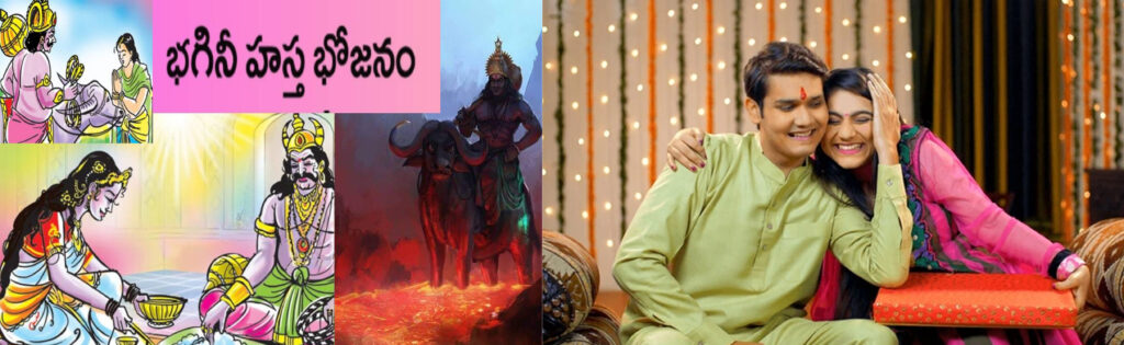 సూర్యుడికి ఒక కుమారుడు ఒక కుమార్తె ఇద్దరు ఉంటారు. వారి పేర్లు యమధర్మరాజు, అమ్మాయిపేరు యమున చెల్లెలికి అన్నపైన విపరీతమైన ప్రేమాభిమానాలు చాలా ఎక్కువ. ఆమె వివాహమై వెళ్ళాక తన సోదరుడిని తన ఇంటికి ఎన్నోసార్లు పిలిచింది. కానీ యమధర్మరాజు వెళ్ళలేకపోయాడు.చివరికి ఒకసారి ఈ కార్తీక మాస విదియ రోజున సోదరుడు వచ్చాడని యమున సంతోషంగా పిండివంటలతో భోజనం పెట్టింది. చాలా రోజుల తర్వాత సోదరీ సోదరులు కలుసుకోవటంతో ఇరువురూ సంతోషించారు. ఆ సంతోషంతో యమధర్మరాజు యమునని ఏదైనా వరం కోరుకోమన్నాడు. ఆమె ఈ కార్తీకశుధ్ధ విదియనాడు లోకంలో ఎక్కడైనా సరే, తన సోదరి ఇంటికి వెళ్ళ భోజనం చేసిన సోదరులకి ఆయురారోగ్యాలు ప్రసాదించమని అడిగింది. ఈ కోరికకి యమధర్మరాజు సంతోషించి, అలా వేడుక జరుపుకున్న వారికి అపమృత్యు దోషం (అకాల మరణం) లేకుండా వుంటుంది, ఆ సోదరి సౌభాగ్యవతిగా వుంటుంది అని వరాలిచ్చాడట. అందువలనే ఈ ఆచారం ఆచరణలోకి వచ్చింది.యమునకు, యముడికి గల ఈ అపురూప అనురాగ బంధమే యమ ద్వితీయ పేరుతో అద్వితీయ పర్వదినంగా ఖ్యాతి పొందింది. సోదరి చేతి వంట కాబట్టి భగినీ హస్తభోజనంగా ప్రాచుర్యంలోకి వచ్చింది. తోబుట్టువు ఇంట్లో భోజనం చేసినప్పుడు-సోదరుడు ఆమెకు చీర, పసుపు, కుంకుమ, పూలు, పండ్లు, ఇతర కానుకలిచ్చే సంప్రదాయమూ ఉంది.