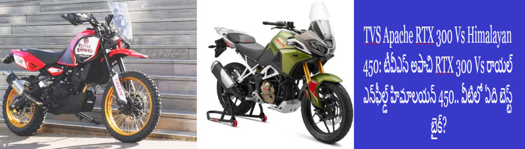 TVS అపాచీ ఆర్టీఎక్స్ 300 ఫీచర్లుTVS Apache RTX 300 బైక్ 2025 అక్టోబర్ 15న లాంచ్ అయింది. టీవీఎస్ నుంచి వచ్చిన మొట్టమొదటి అడ్వెంచర్ టూరర్ బైక్ ఇది. దీంట్లో 299.1 సీసీ లిక్విడ్-కూల్డ్, సింగిల్-సిలిండర్ DOHC ఇంజిన్ ఉంటుంది. 6-స్పీడ్ గేర్బాక్స్ దీని సొంతం. ఇది సుమారు 36 PS పవర్, 28.5 Nm టార్క్ అందిస్తుంది. ఇందులో అర్బన్, రెయిన్, టూర్, ర్యాలీ వంటి నాలుగు రైడింగ్ మోడ్స్ ఉన్నాయి. ABS, ట్రాక్షన్ కంట్రోల్ లాంటి స్పెసిఫికేషన్స్ దీని సొంతం. ఈ బైక్ అన్ని వేరియంట్లలో క్రూయిజ్ కంట్రోల్ స్టాండర్డ్గా ఉంటుంది. టెక్నాలజీ పరంగా.. ఆర్టీఎక్స్ 300లో 5-అంగుళాల TFT డిస్ప్లే ఉంటుంది. ఇది TVS SmartXonnect సిస్టమ్ ద్వారా మొబైల్ కనెక్టివిటీ, ఇతర అప్డేట్స్ డిస్ప్లే చేస్తుంది. సస్పెన్షన్ కోసం ముందువైపు USD ఫోర్క్, వెనుక వైపు మోనో-షాక్ ఫెసిలిటీస్ ఉన్నాయి. డ్యుయల్-ఛానల్ ABS, ట్రాక్షన్ కంట్రోల్ వంటి సేఫ్టీ ఫీచర్లతో ఇది రైడర్లను అట్రాక్ట్ చేస్తోంది. దీని ధర రూ.1.99 లక్షలు (ఎక్స్-షోరూమ్).రాయల్ ఎన్ఫీల్డ్ హిమాలయన్ 450 ఫీచర్లుRoyal Enfield Himalayan 450 బైక్ 2023 నవంబర్ 24న లాంచ్ అయింది. ఇది పాత హిమాలయన్ మోడల్ కంటే అడ్వాన్స్డ్ అడ్వెంచర్ మోటార్సైకిల్. ఈ బైక్లో కొత్త 452 సీసీ లిక్విడ్-కూల్డ్ ‘షెర్పా’ ఇంజిన్ ఉంటుంది. ఈ మోటార్ 40.02 PS పవర్, 40 Nm టార్క్ ఉత్పత్తి చేస్తుంది. 6-స్పీడ్ గేర్బాక్స్తో దూసుకెళ్తుంది. ఈ బైక్లో ముందువైపు 43 mm USD ఫోర్క్లు, వెనుకవైపు మోనో-షాక్ సస్పెన్షన్ సెటప్తో ఇది మంచి ఆఫ్-రోడ్ ఎక్స్పీరియన్స్ ఇస్తుంది. ముందు, వెనుక డిస్క్ బ్రేక్లు, డ్యుయల్-ఛానల్ ABS ఫీచర్, రైడర్ రియర్ ABSను ఆఫ్ చేసుకునే ఆప్షన్.. లాంటి ఫీచర్లు ఉన్నాయి. TFT డిస్ప్లే, రైడింగ్ మోడ్స్, స్విచ్బుల్ ABS వంటి ఫీచర్లతో ఇది సేల్స్లో దూసుకెళ్తోంది. దీని ధర రూ.3.06 లక్షల నుంచి రూ.3.20 లక్షల (ఎక్స్-షోరూమ్) వరకు ఉంది.ఏది బెస్ట్?TVS Apache RTX 300, Royal Enfield Himalayan 450 రెండూ అడ్వెంచర్ సెగ్మెంట్లో వచ్చిన బైక్స్, కానీ వాటి మధ్య కొన్ని ముఖ్యమైన తేడాలు ఉన్నాయి. అపాచీ RTX 300 అర్బన్ రైడర్స్, వీకెండ్ టూరర్స్కు సెట్ అవుతుంది. తక్కువ బడ్జెట్లో టెక్ ఫీచర్లు, కంఫర్ట్ కోరుకునే వారు దీన్ని కొనడం బెస్ట్. ఎక్కువ బడ్జెట్ పెట్టగలిగే వారు, హార్డ్ కోర్ ఆఫ్ రోడర్స్, లాంగ్ డిస్టెన్స్ రైడర్స్, ప్రీమియం అడ్వాన్స్డ్ రైడింగ్ ఎక్స్పీరియన్స్ కోరుకునే వారు Himalayan 450 కొనడం మంచిది.